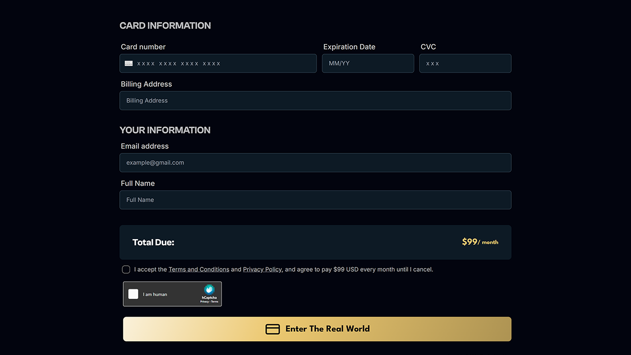 - Enter your info, accept terms/privacy policy, and click “Enter The Real World.”